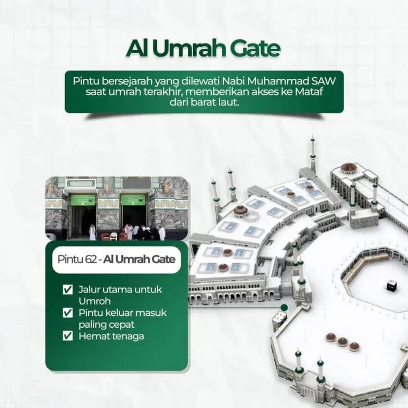 Pintu 62 (Bab Al-Umrah) adalah gerbang utama di Masjidil Haram, Mekah, yang terletak di area barat laut dan sering menjadi akses favorit jamaah umrah menuju area thawaf (Mataf). Gerbang ini sangat ikonik dan strategis untuk masuk ke pelataran Ka’bah, memudahkan akses bagi jamaah yang ingin beribadah, serta sangat bersejarah karena pintu ini pernah dilewati Rasulullah ketika umrah terkahir.